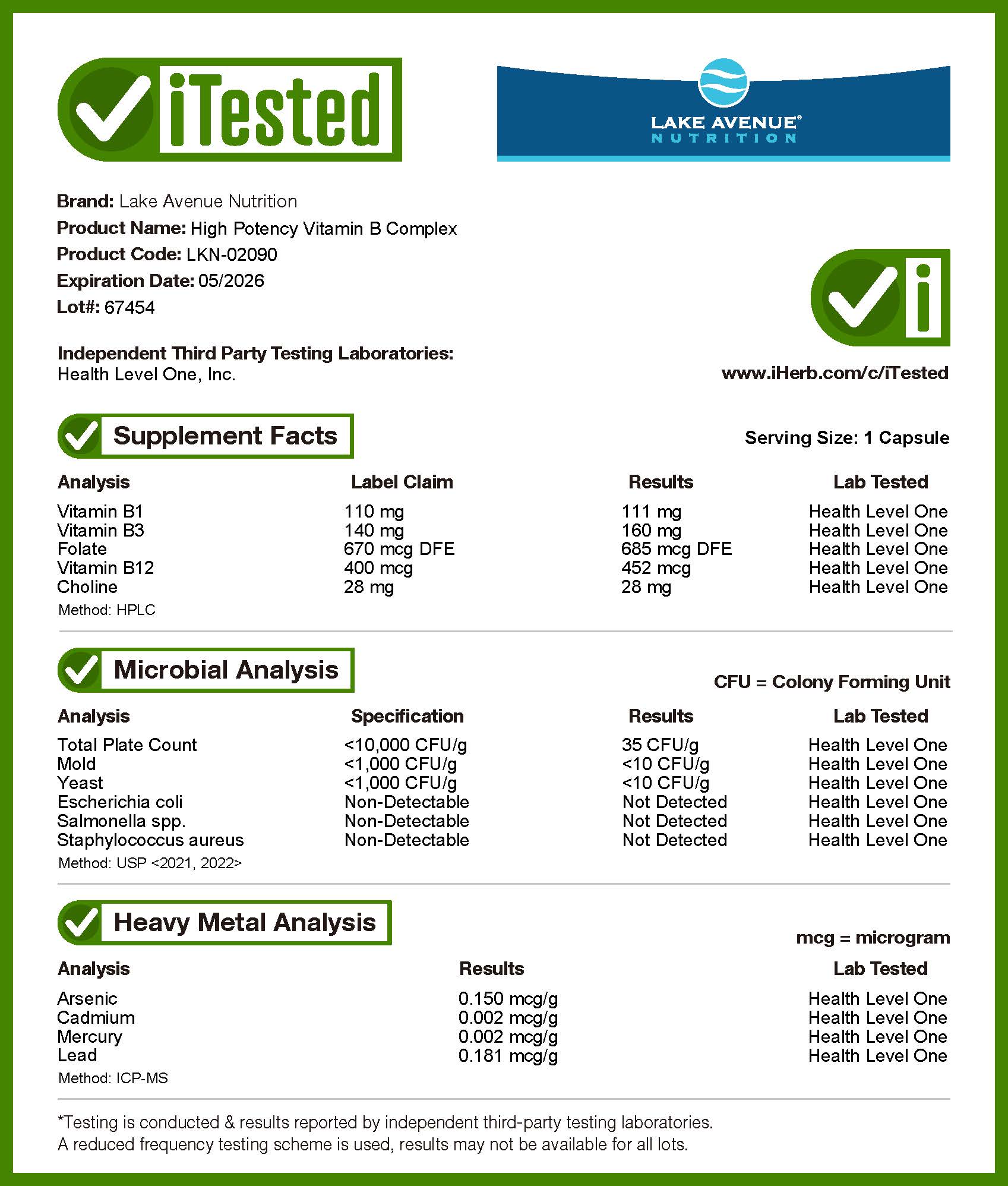 Le complexe de vitamines B haute efficacité de California Gold Nutrition® contient les 8 vitamines B (B1 [thiamine], B2 [riboflavine], B3 [niacine], B5 [acide pantothénique], B6 [pyridoxine], B7 [biotine], B9 [folate] et B12 [cobalamine]) dans des capsules végétales.