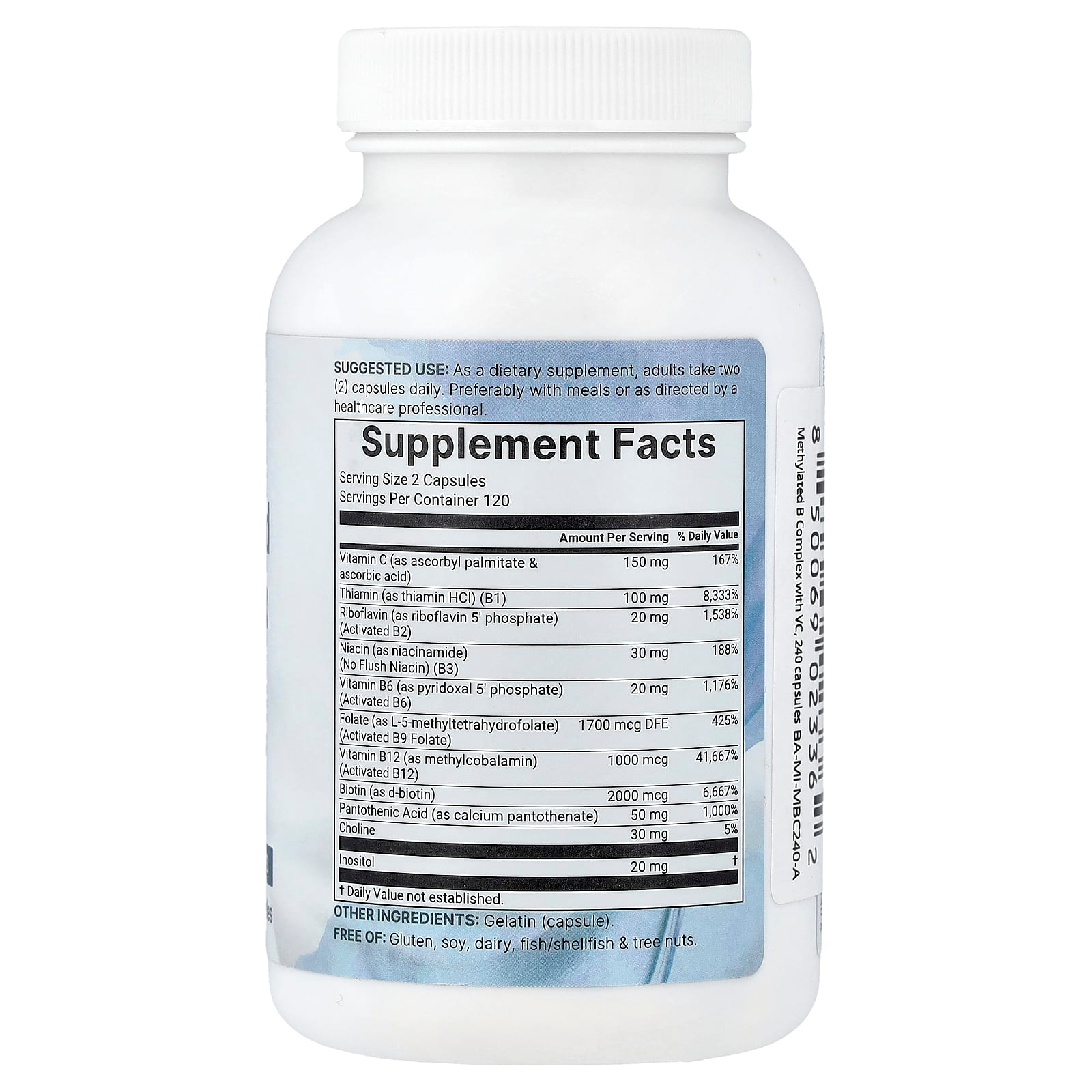 Chaque flacon contient 240 capsules. Contient de la vitamine C (palmitate d’ascorbyle + acide ascorbique), de la thiamine, de la riboflavine (R5P), de la niacine (nicotinamide), de la vitamine B6 (P5P), du folate, de la vitamine B12 (méthylcobalamine), de la biotine, de l’acide pantothénique, de la choline et de l’inositol par portion.