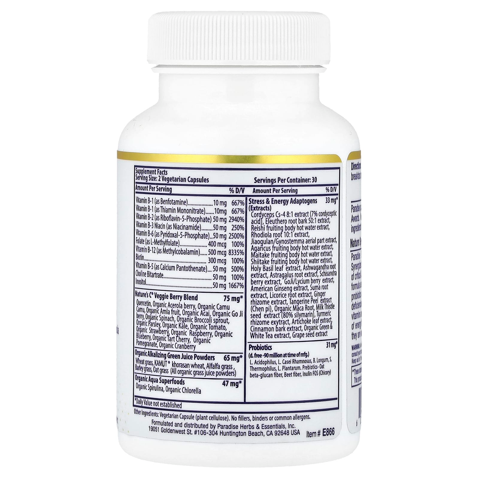 Le complexe de vitamines B Earth’s Blend de Paradise est un véritable superaliment Nature Synergized. Il fournit des formes enzymatiquement actives de vitamines B essentielles (B1, B2, B6), d’acide folique et de vitamine B12. Notre formule renferme les bienfaits de véritables aliments entiers associés à des vitamines, des probiotiques et des adaptogènes anti-stress, et ce, non seulement pour combler les carences, mais aussi pour contribuer à soutenir la santé de l’ensemble de l’organisme Les vitamines B sont essentielles pour le métabolisme et la production d’énergie à partir des aliments. Les vitamines B doivent être reconstituées, car elles sont hydrosolubles et facilement excrétées par l’organisme.
